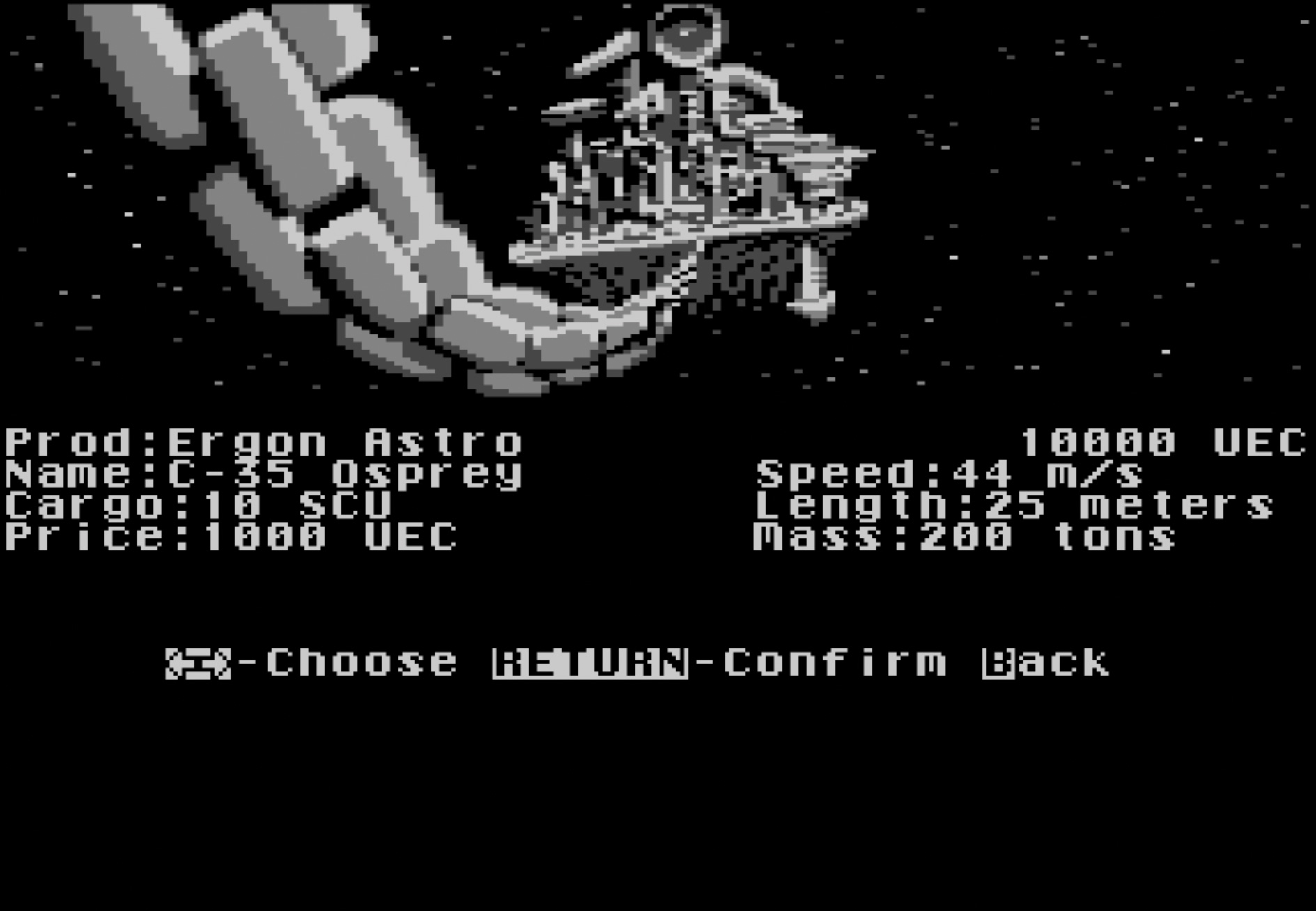Dowodzisz statkiem C-35 Osprey. Jest to najmniejszy, ale zwinny statek towarowy wyprodukowany przez Egon Astro. To nie jest spełnienie twoich marzeń, ale w końcu jesteś na swoim. Nikt nie będzie ci mówił, co powinieneś robić. To dzień, w którym zaczynasz życie jako prywatny przewoźnik w Zjednoczonym Imperium Ziemi/